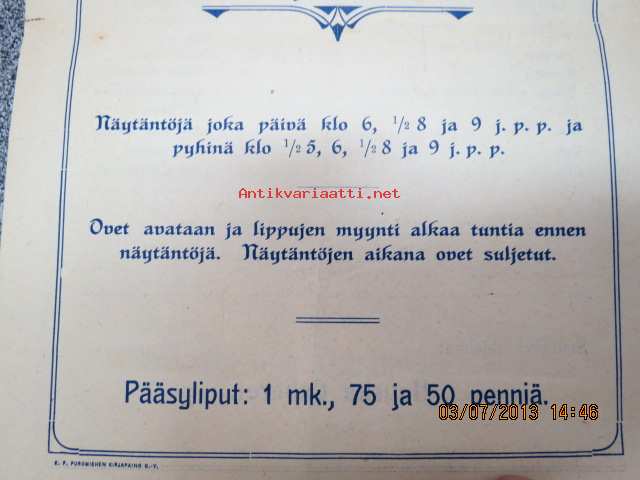 | Saatavilla | 1 kpl | | Julkaisuvuosi | 1913? | | Sivuja | 4 | | Kunto | K3 | | Sidonta/painoasu | Pienpainate | | Kielet | Suomi, Ruotsi |