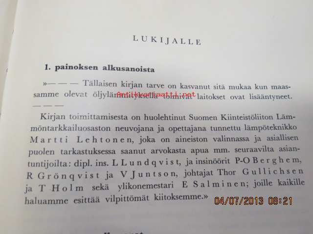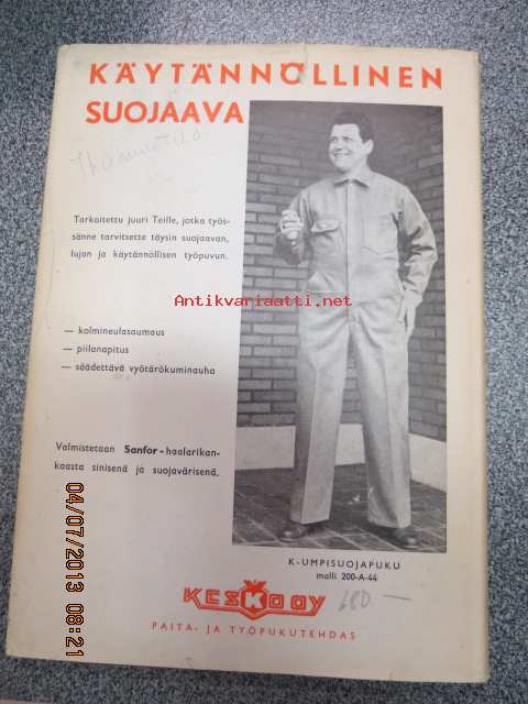 | Saatavilla | 1 kpl | | Julkaisuvuosi | 1959 | | Sivuja | 184 | | Painos | 2. | | Kunto | K3 | | Sidonta/painoasu | Sidottu (kansipaperit) | | Kielet | Suomi |
