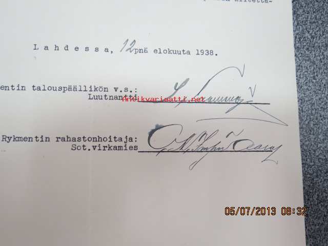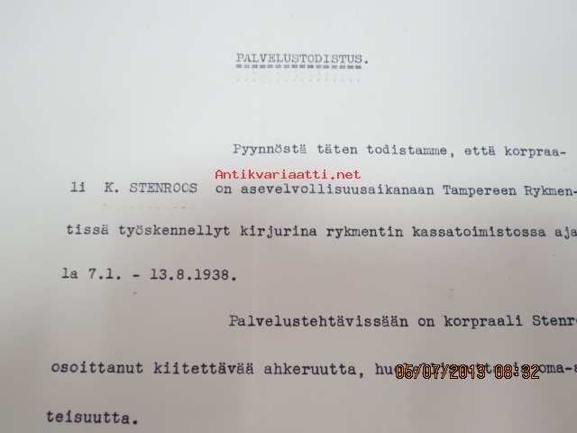 Palvelustodistus korpraali Klaus Aarne Stenroos toiminut Tampereen Rykmentin kirjurina kassatoimistossa.... 12.8.1938 -todistus