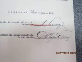 | Saatavilla | 1 kpl | | Julkaisuvuosi | 1938 | | Sivuja | 1 | | Kunto | K2 | | Rei´itetty | | Sidonta/painoasu | Pienpainate | | Kielet | Suomi |