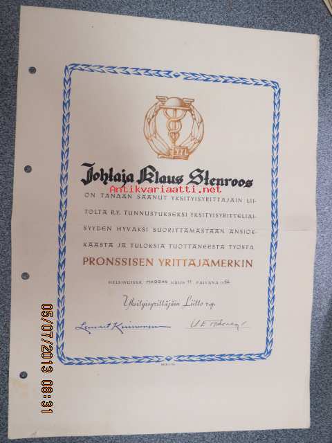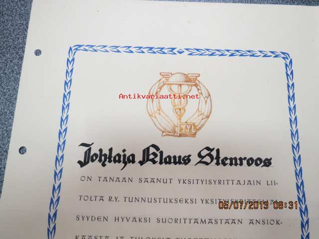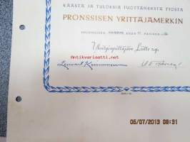 Yksityisyrittäjäin Liitto / Johtaja Klaus Stenroos / Pronssinen yrittäjämerkki 1952 -myöntökirja