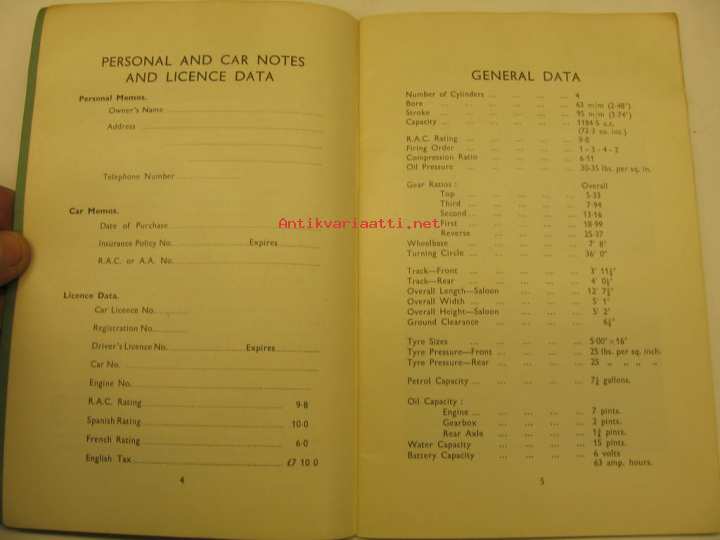 Hillman Motor Car Company, 1938Alkuperäinen käyttöohjekirja.