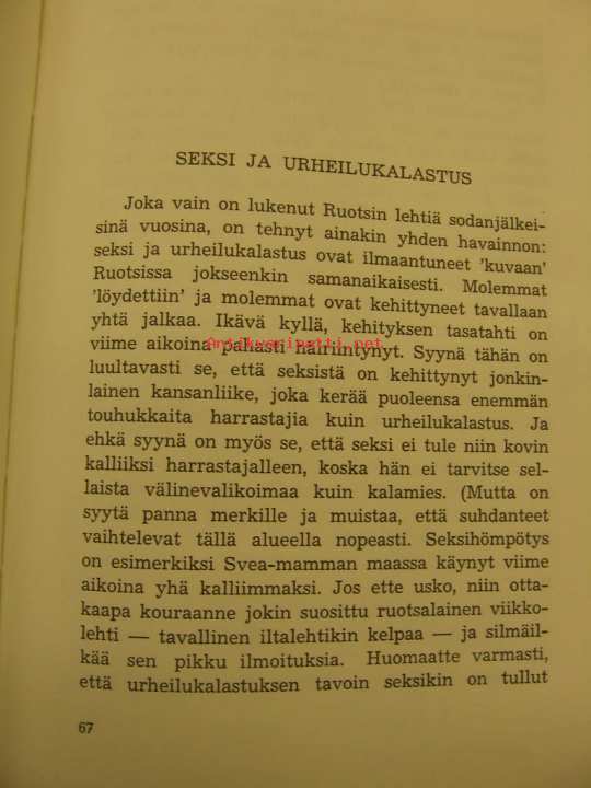 | Saatavilla | 1 kpl | | Julkaisuvuosi | 1967 | | Sivuja | 199 | | Painos | 1. | | Kunto | K3 | | Sidonta/painoasu | Nidottu (pehmeäk.) | | Kielet | Suomi |