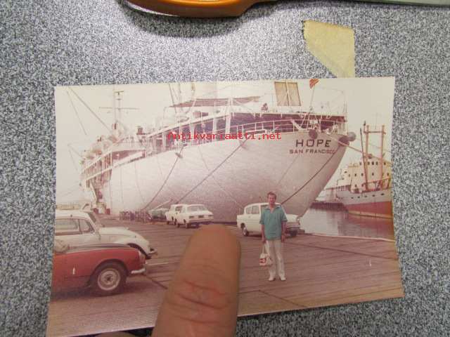 SS HOPE / San Franscisco - suomalaissiirtolainen laivan vieressä, ilmeisesti jossain Suomen satamassa, autot kun ovat Suomen kilvissä (mm. Ford Escort, Ford Anglia, Volkswagen) 1975 -valokuva