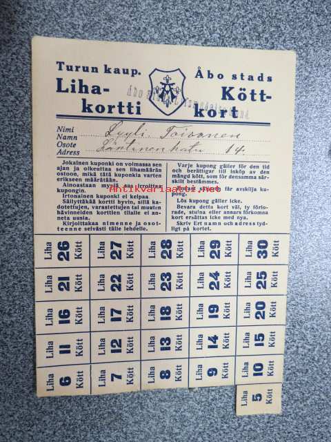 Turun kaupungin Lihakortti Åbo stads Köttkort Alma Toivonen 1920-luvun pula-aika ( sin. teksti)