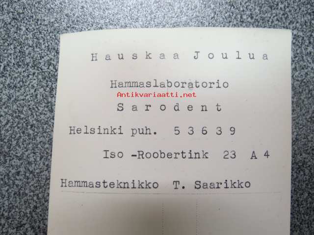 Hammaslaboratorio Sarodent, Helsinki, Iso-Roobertinkatu 23, hammasteknikko T. Saarikko -valokuva / omatekoinen joulukortti
