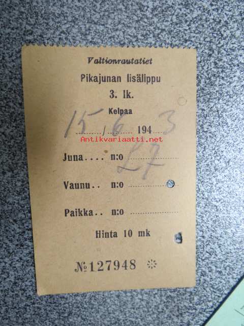 Valtionrautatiet pikajunan lisälippu 3. lk 15.6.1943