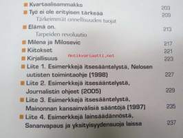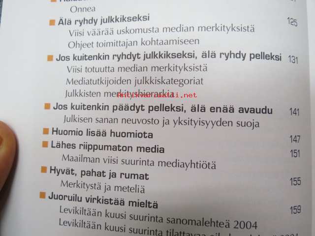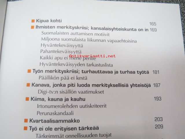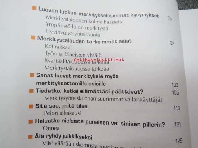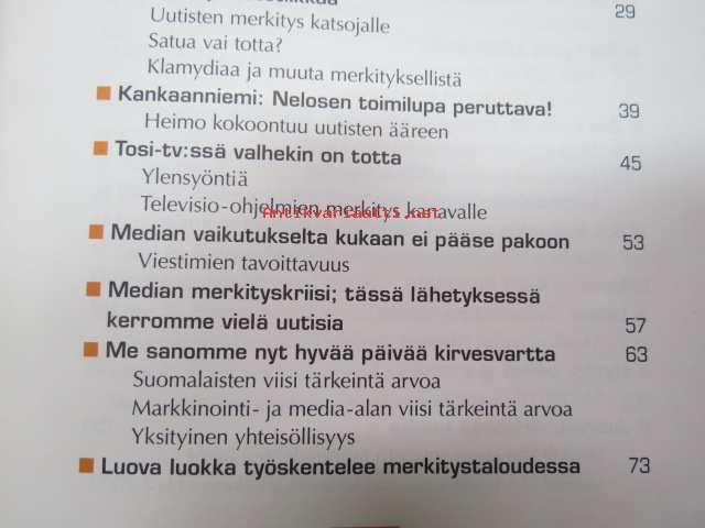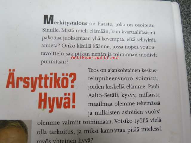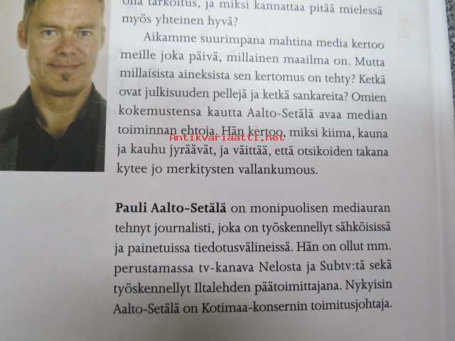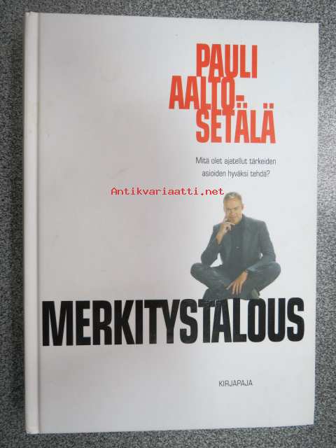 16 x 22 cm. Takakansi: Merkitystalous on haaste, joka on osoitettu Sinulle. Mistä mieli elämään, kun kvartaalifasismi pakottaa juoksemaan yhä kovempaa, eikä selityksiä anneta. Onko käsillä käänne, jossa nopea voitontavoittelu saa pitkän nenän ja toiminnan motiivit punnitaan? Teos on ajankohtainen keskustelupuheenvuoro niistä voimista, joiden keskellä elämme. Pauli Aalto-Setälä kysyy, millaista maailmaa olemme tekemässä ja millaisten asioiden vuoksi olemme valmiit toimimaan. Voisiko työllä vielä olla tarkoitus, ja miksi yksilön kannattaa pitää mielessä myös yhteinen hyvä? Aikamme suurimpana mahtina media kertoo meille joka päivä, millainen maailma on. Mutta millaisista aineksista sen kertomus on tehty? Ketkä ovat julkisuuden pellejä ja ketkä sankareita? Miksi? Omien kokemustensa kautta Aalto-Setälä avaa median ehtoja. Hän kertoo, miksi kiima, kauna ja kauhu jyräävät, ja väittää, että otsikoiden takana kytee merkitysten vallankumous. Pauli Aalto-Setälä on monipuolisen mediauran tehnyt journalisti, joka on työskennellyt sähköisissä ja painetuissa tiedotusvälineissä. Hän on ollut mm. perustamassa tv-kanava Nelosta ja Subtv:tä sekä työskennellyt Iltalehden päätoimittajana. Nykyisin Aalto-Setälä on Kotimaa-konsernin toimitusjohtaja.