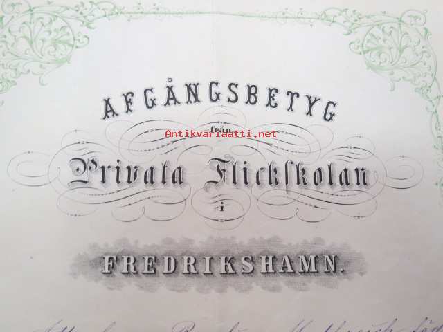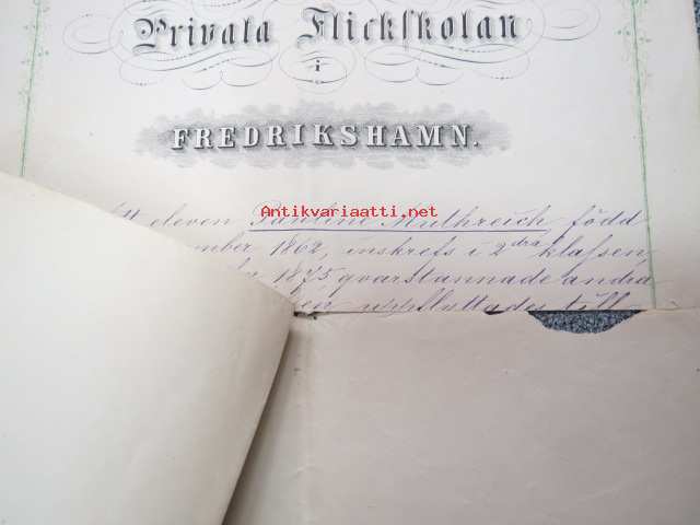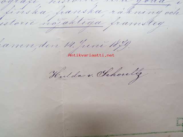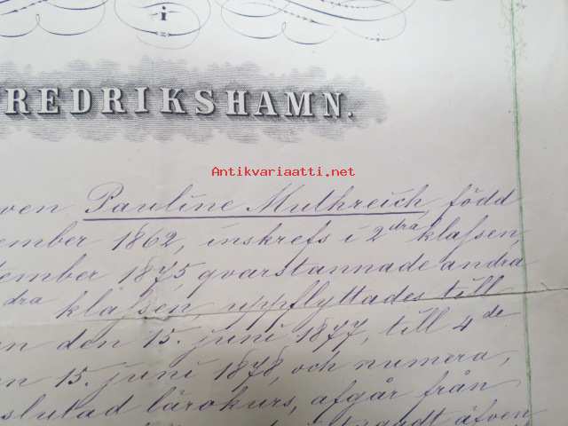 Afgångsbetyg från Privata Flickskolan i Fredrikshamn - Att eleven Paulinen Mutreich, född 6.12.1862... -erotodistus, allekirjoittanut Huulda von Schoultz