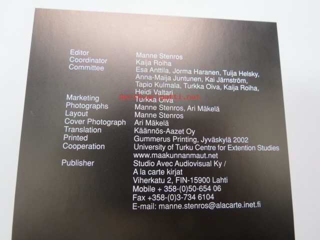 | Saatavilla | 2 kpl | | Julkaisuvuosi | 2002 | | Sivuja | 96 | | Painos | 1. | | Kunto | K3 | | Sidonta/painoasu | Kuvitettu kovakantinen | | ISBN | 952-5290-09-3 | | Kielet | Suomi |