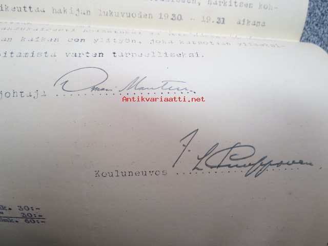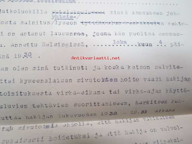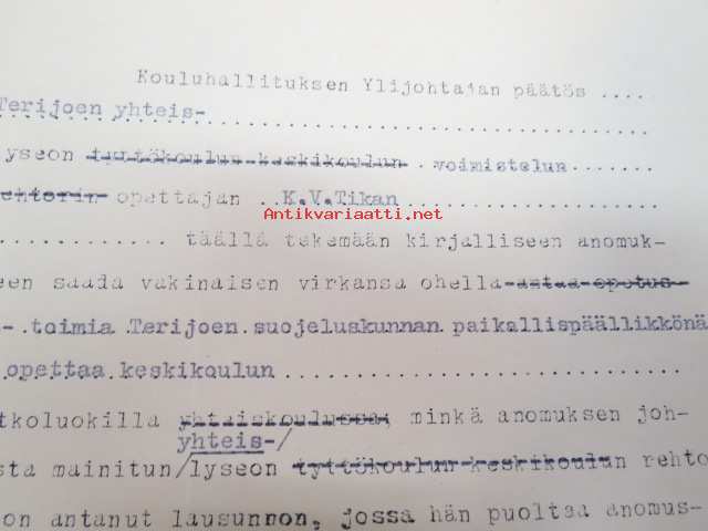 Kouluhallituksen Ylijohtjan päätös Terijoen Yhteislyseon poikain voimistelunopettajan K.V. Tikan anomus toimia Terijoen Suojeluskunnan paikallispäällikkönä... 1930 -asiakirja