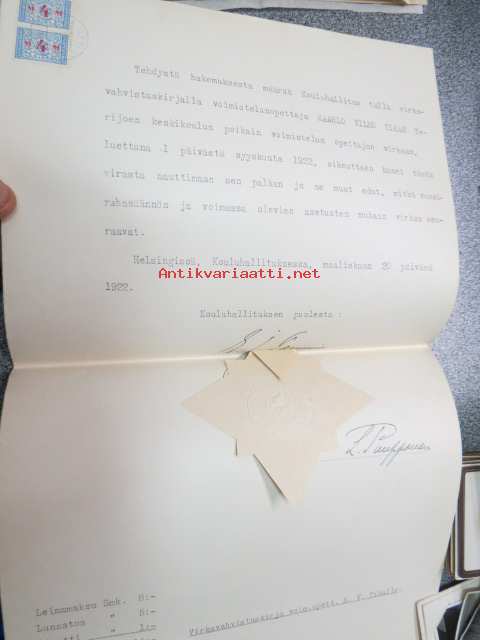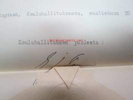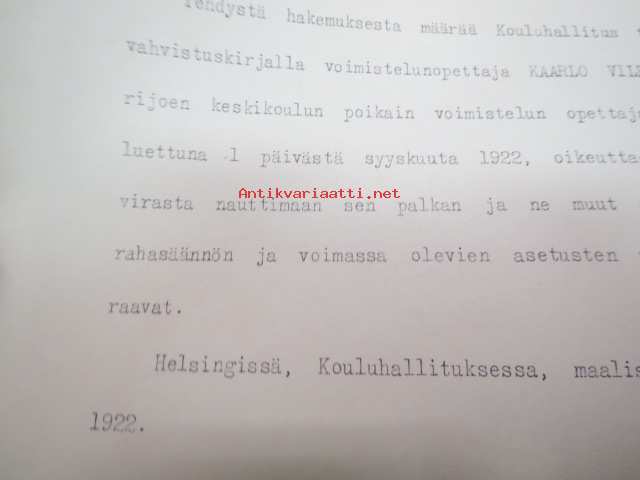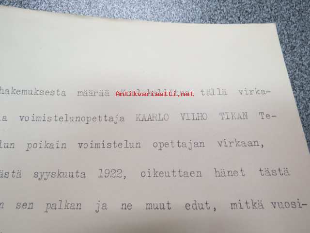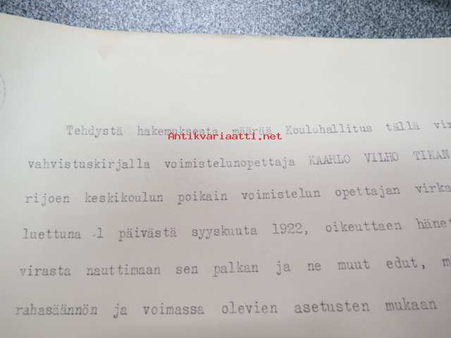 Kouluhallitus määrää tällä virkavahvistuskirjalla Terijoen keskikoulun poikain voimistelunopettajan virkaan K.V. Tikan.... 20.3.1920 -asiakirja
