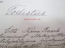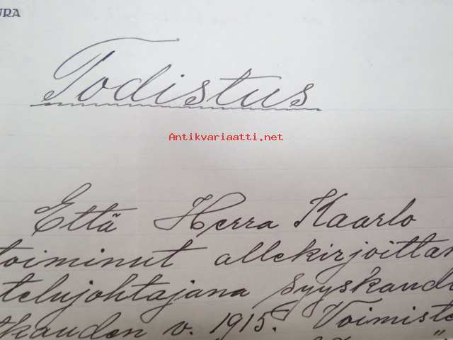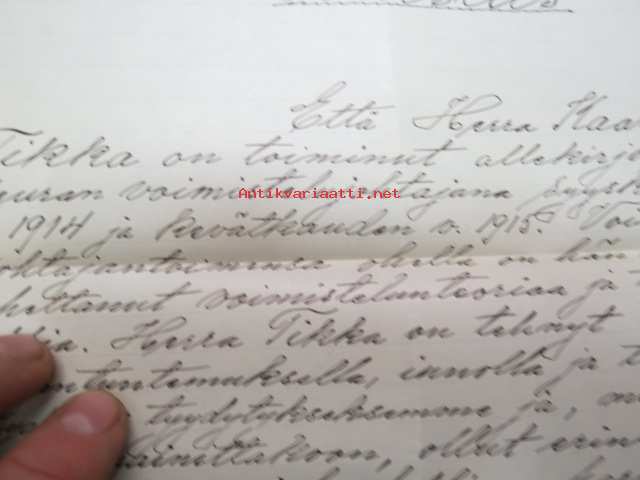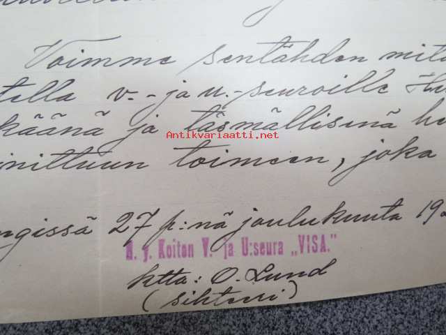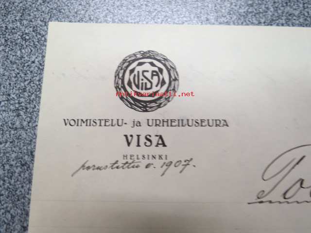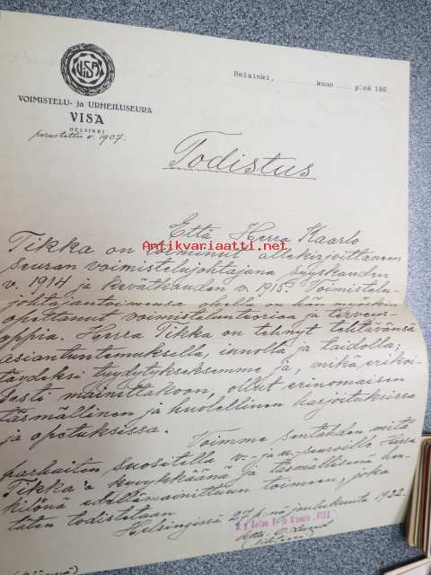 Voimistelu- ja Urheiluseura Visa, Helsinki, Todistus, että Kaarlo Tikka on toiminut mainitun seuran voimistelujohtajana... 27.1.21922 -asiakirja
