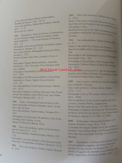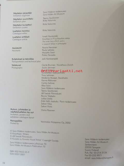 | Saatavilla | 1 kpl | | Julkaisuvuosi | 2002 | | Sivuja | 151 | | Painos | 1 | | Kunto | K3 | | Omistuskirjoitus Teemu Saukkoselta Kauko Lehtiselle, ensimmäisellä aukeamalla | | Sidonta/painoasu | Sidottu (kansipaperit) | | ISBN | 952-9652-25-9 | | Kielet | Suomi, Englanti |