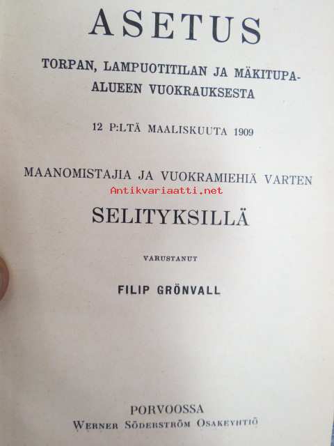 Uusi maanvuokra-asetus 12 p:ltä maaliskuuta 1909 - Asetus torpan, lampuotitilan ja mäkitupa-alueen vuokrauksesta - maanomistajia ja vuokramiehiä varten - selityksillä varustanut Filip Grönvall