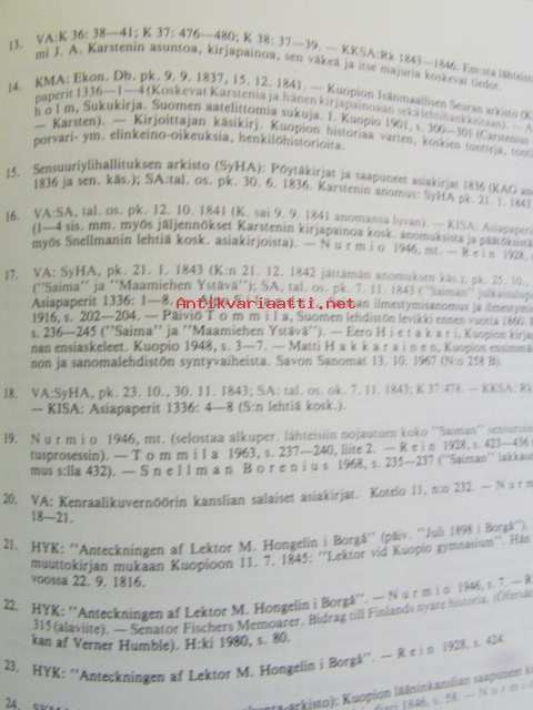 | Saatavilla | 1 kpl | | Sivuja | 57 | | Kunto | K3 | | Sidonta/painoasu | Nidottu (pehmeäk.) | | ISBN | 951-9383-35-2 | | Kielet | Suomi |
