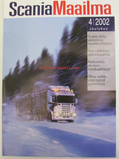 Scania Maailma 2002 nr 4, sis. mm; Scania siirtyy varaosissa eurohinnoitteluun, Uusi sähköinen seurantapalvelu, Rekkaveturi on myös monikäyttöauto, Oikea voitelu pitää pyörre ym.