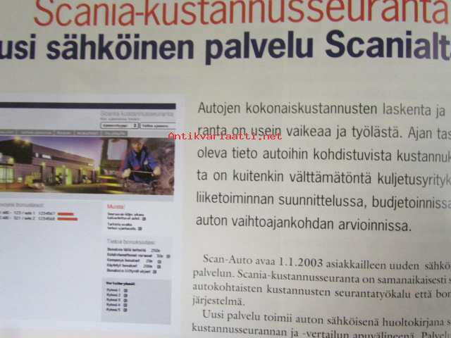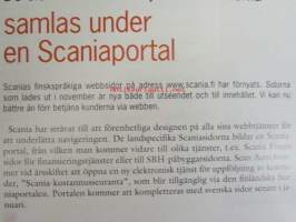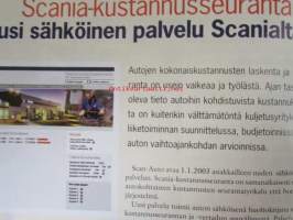 Scania Maailma 2002 nr 4, sis. mm; Scania siirtyy varaosissa eurohinnoitteluun, Uusi sähköinen seurantapalvelu, Rekkaveturi on myös monikäyttöauto, Oikea