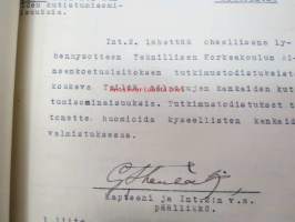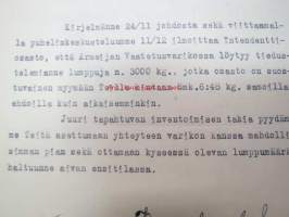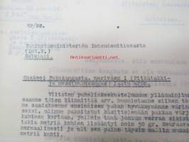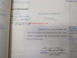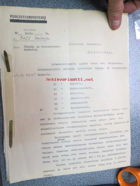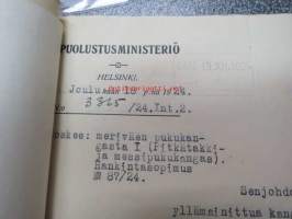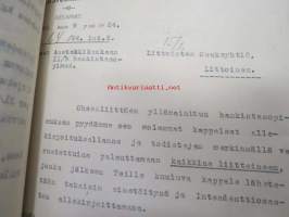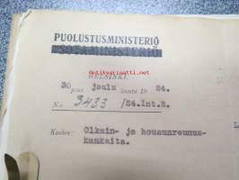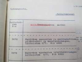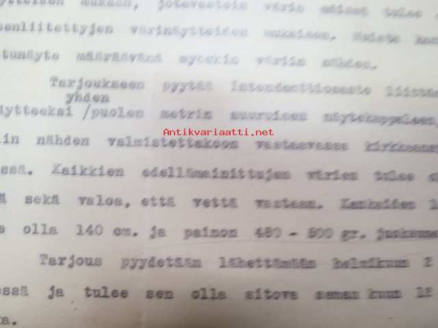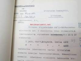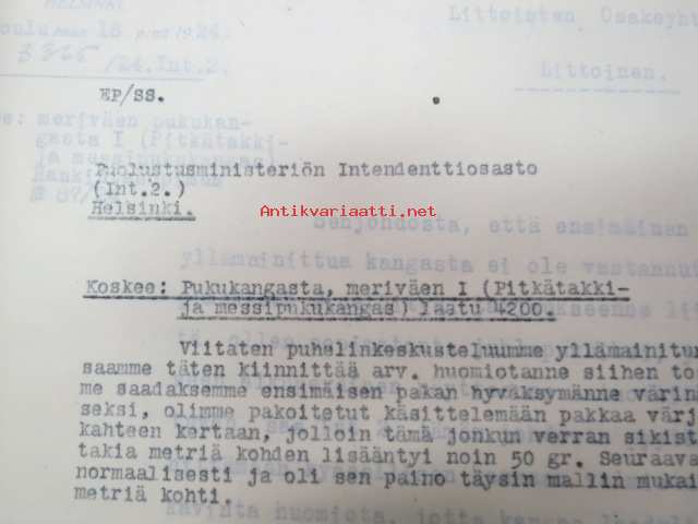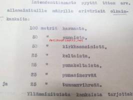 Puolustusministeriö / Littoisten Verkatehdas Oy -kirjeenvaihtokansio, joka käsitteelee tilattuja kankaita, niiden ominaisuuksia, toimituksia ym. puolustusvoimien