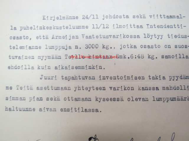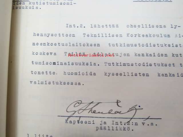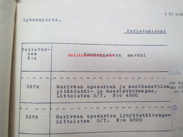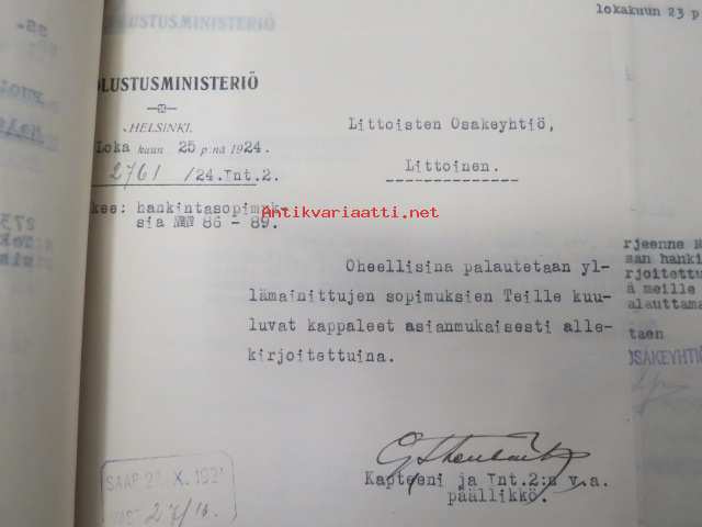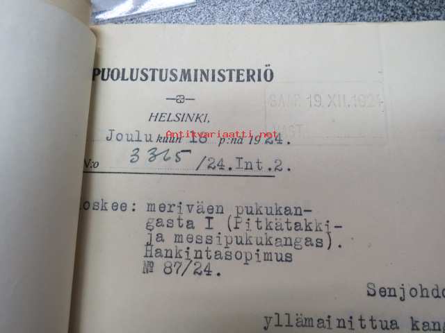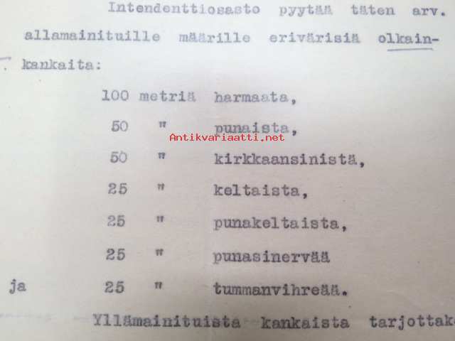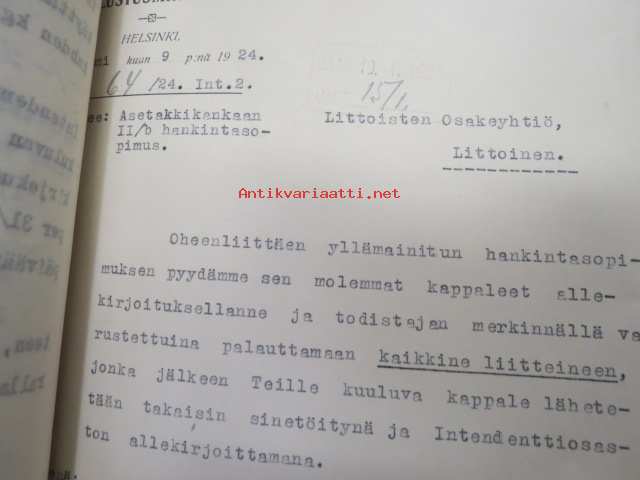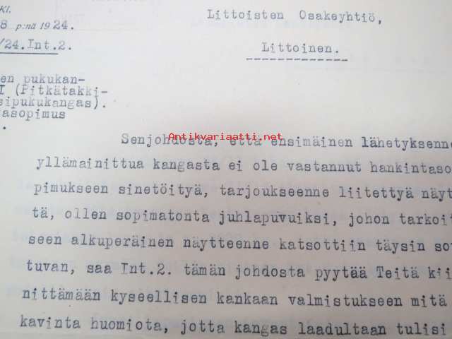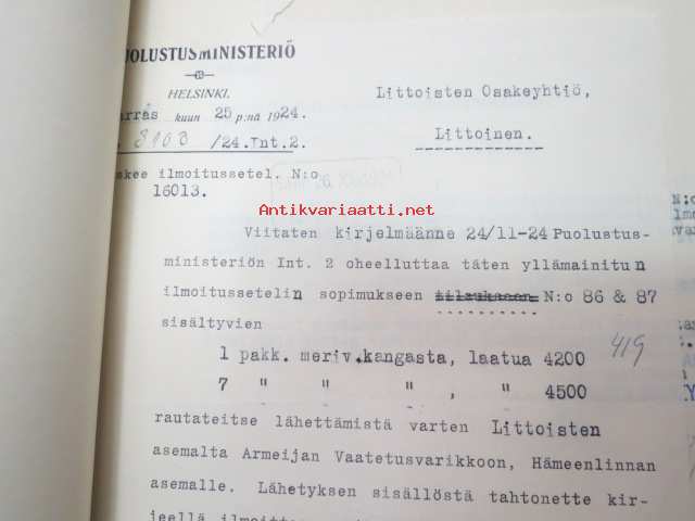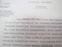 Puolustusministeriö / Littoisten Verkatehdas Oy -kirjeenvaihtokansio, joka käsitteelee tilattuja kankaita, niiden ominaisuuksia, toimituksia ym. puolustusvoimien alkuvaiheilta