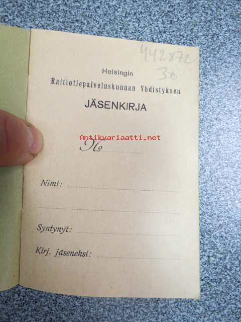 Helsingin Raitiotiepalveluskunnan Yhdistyksen jäsenkirja - Medlemsbok för Spårvägsmanna-Föreningen i Helsingfors -käyttämätön raitiotiemiesten yhdistyksen jäsenkirja, suomen- & ruotsinkielinen