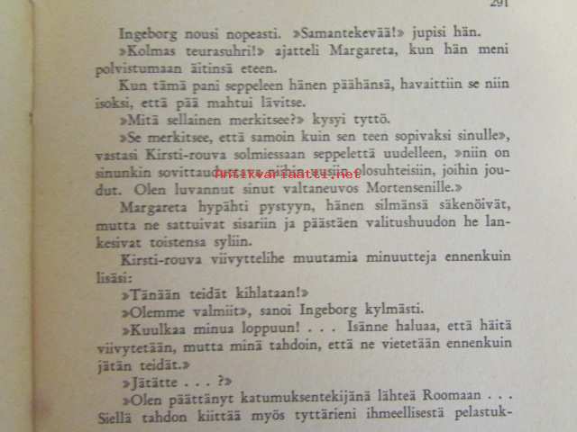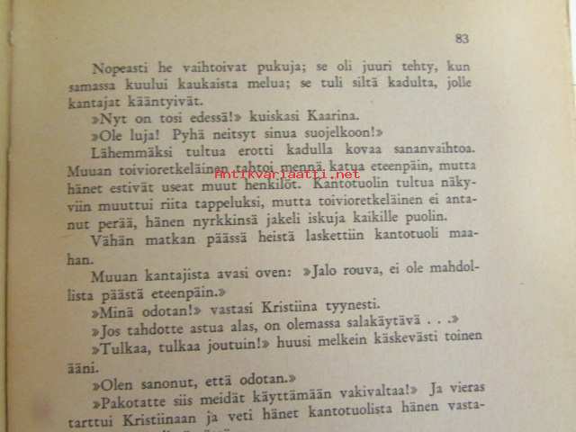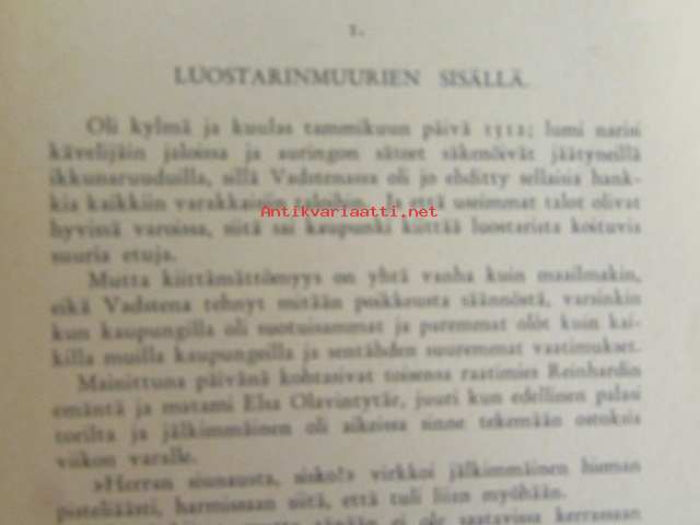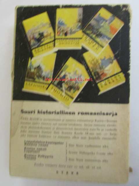 | Saatavilla | 1 kpl | | Julkaisuvuosi | 1934 | | Sivuja | 370 | | Painos | 1. | | Kunto | K2 | | Selässä pieni repeytymä kautta kuluma, tarkasta kuvasta | | Sidonta/painoasu | Nidottu (pehmeäk.) | | Kielet | Suomi |