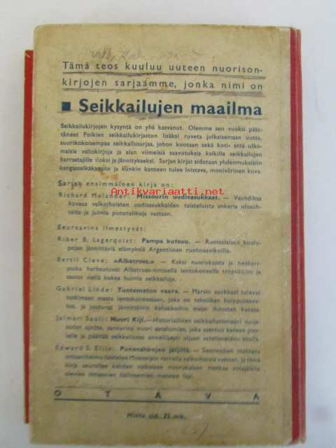 | Saatavilla | 1 kpl | | Julkaisuvuosi | 1936 | | Sivuja | 186 | | Kunto | K2 | | Sidonta/painoasu | Nidottu (pehmeäk.) | | Kielet | Suomi |