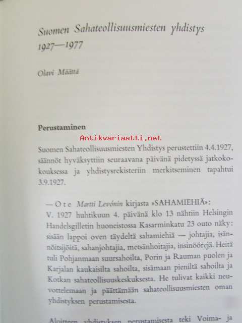 | Saatavilla | 1 kpl | | Julkaisuvuosi | 1977 | | Sivuja | 151 | | Kunto | K3 | | Sidonta/painoasu | Sidottu (kovak.) | | ISBN | 951-99110-5-7 | | Kielet | Suomi |