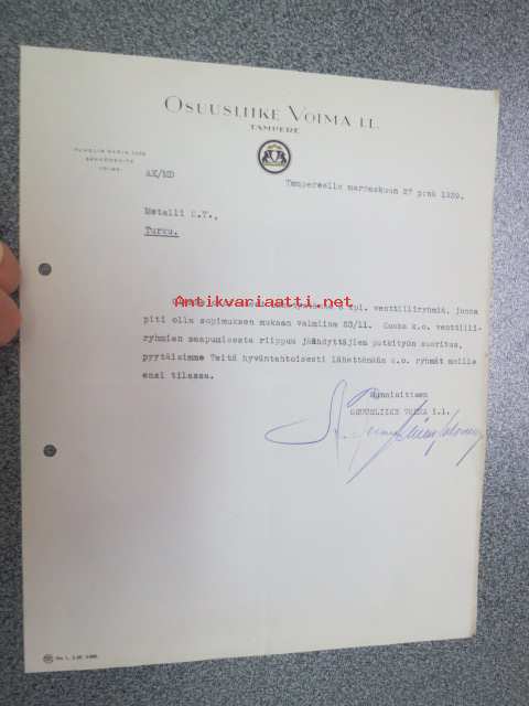 Osuusliike Voima I.L. Tampere, 27.11.1939 -asiakirja