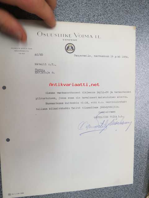 Osuusliike Voima I.L. Tampere, 16.11.1939 -asiakirja