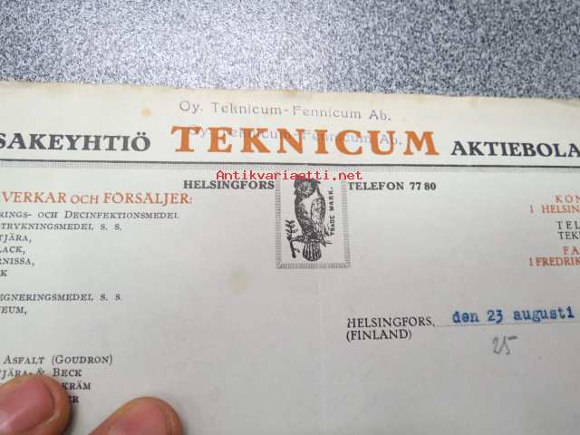 Oy Teknicum-Fennicum Ab, Helsinki 23.8.1921 -asiakirja