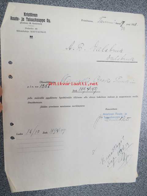 Kristiinan Rauta- ja Talouskauppa Oy 17.1.1921 -asiakirja