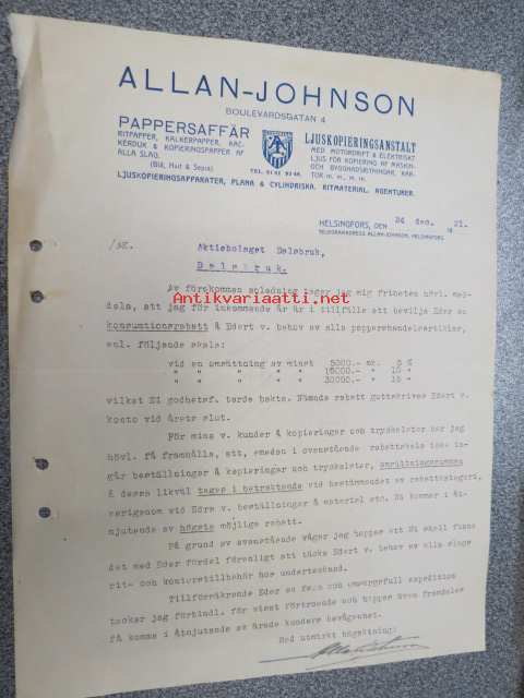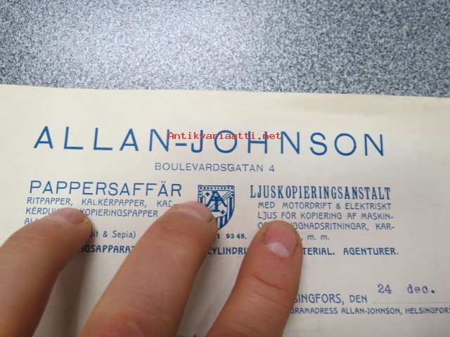 Allan-Johnson Pappersaffär, ljuskopiering, Helsinki, 24.12.1921 -asiakirja