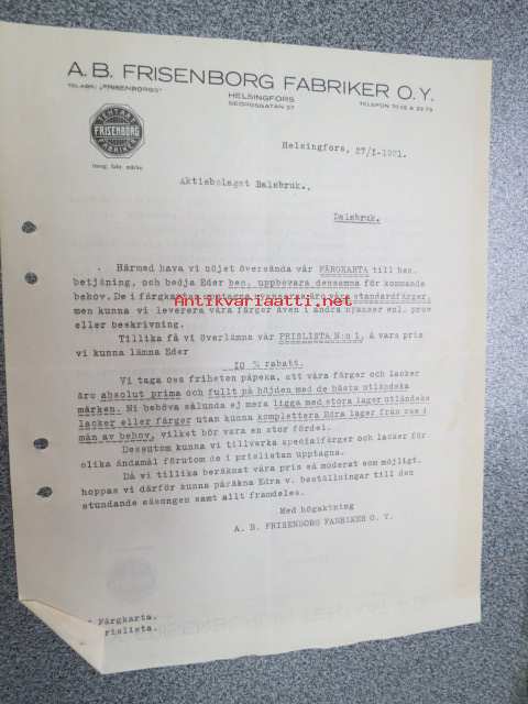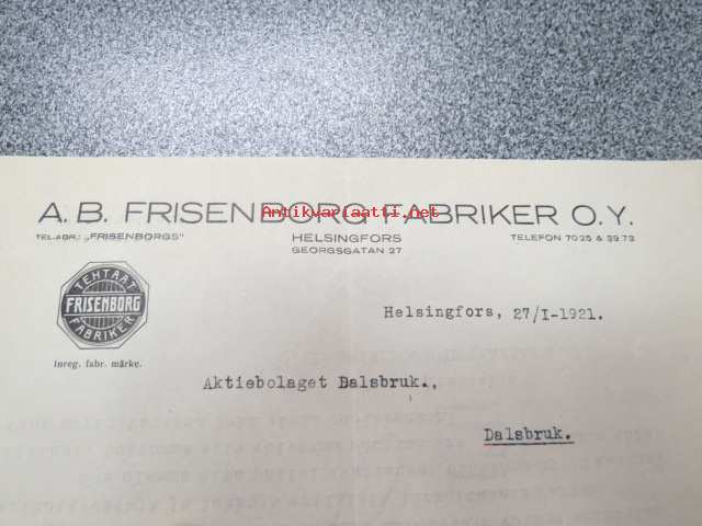 Ab Frisenborg Fabriker Oy, Helsinki, 27.1.1921 -asiakirja