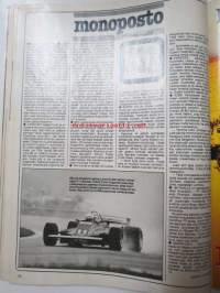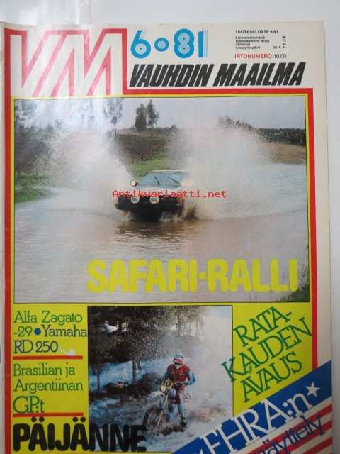 Vauhdin Maailma 1981 nr 6 -mm. FHRA Car Show 1981 helsingin jäähallissa, Rally Csta Smeralda, Drag racing, Indiapolis 500 mailia Johnny Rutherford "Teksasin keltakarhu", Yamaha RD 250, Sadan auton ajot, Safari ralli, 46. Päijänne-ajo, F1 Argentiinan GP Piqutin sooloesitys, F1 Brasilian GP LOLE teki kapinan, Alfa Romeo Zagata 1929.21 x 29 cm.