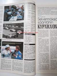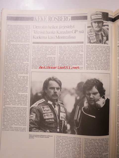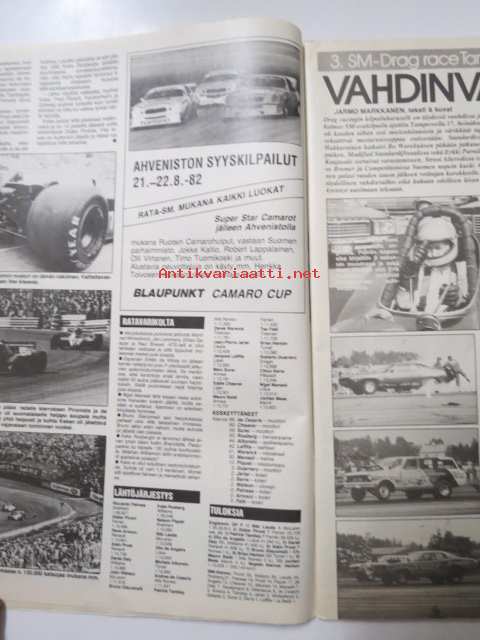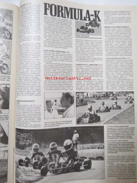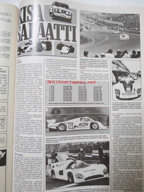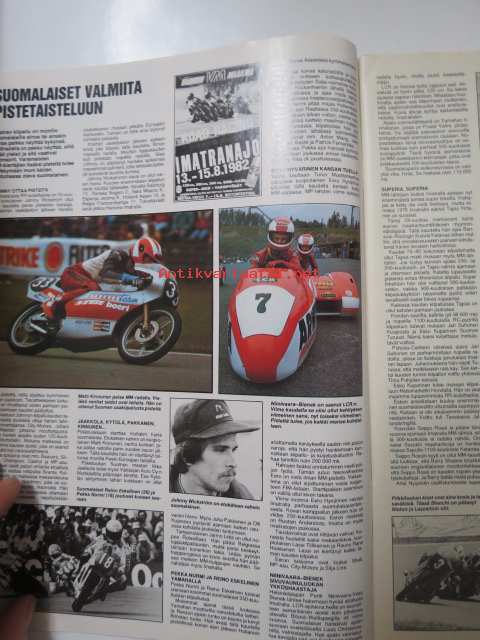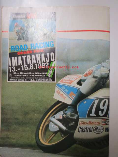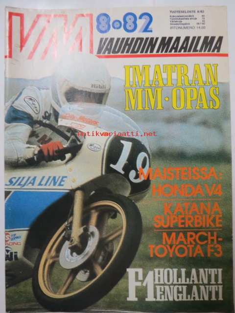 Vauhdin maailma 1982 nr 8 -mm. Imatranajo 1982 MM-opas, Honda V-4, Katana Superbike, VM maistelee Formula 3 by March Volvo 345 GLS Sport ja Matra Murene Herald hirmuinen, Formula 1 Englanti ja Hollanti GP, Vene EM SM Drag Härmälä, Helsinki ralli, Uuden Seelannin ralli.21 x 29 cm.