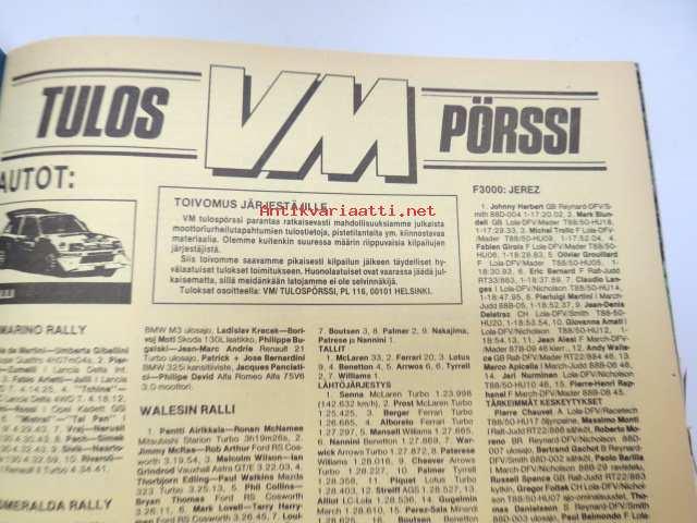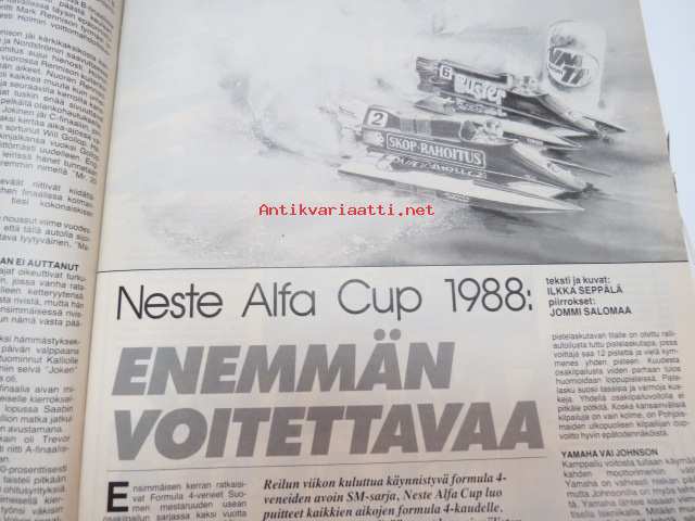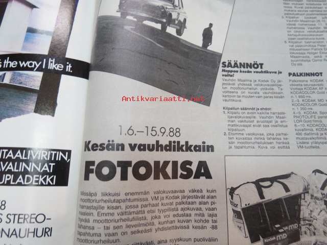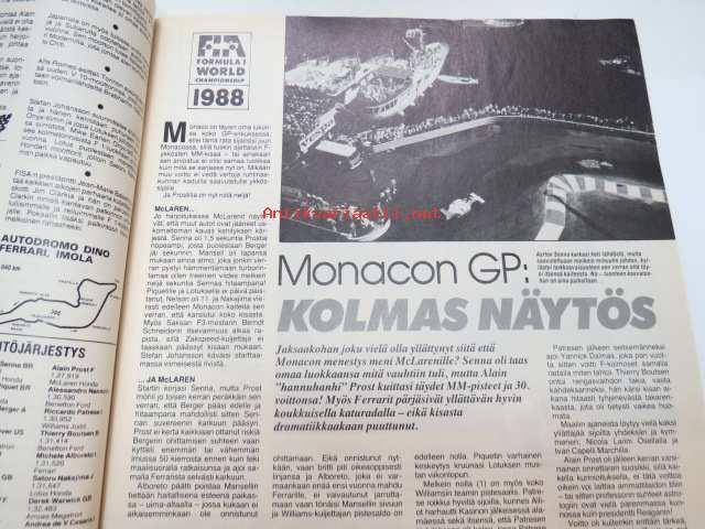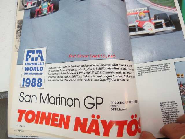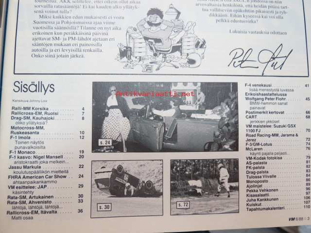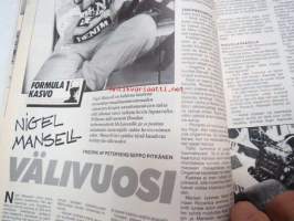Vauhdin maailma 1988 nr 6 -mm. Formula 1 kasvo Nigel Mansell, Formula 1 Imola ja monaco, FHRA Amrican Car Show, Ralli-SM artukainen ja ahvenisto,F-4 venekausi lisää menestystä luvassa, Wolfgang Peter Flohr, Road Racin-MM Jarama & Jerez.21 x 29 cm.