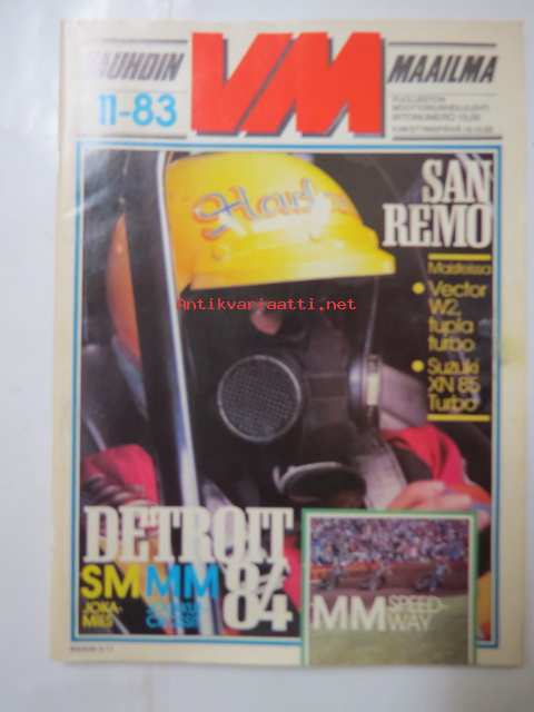 Vauhdin Maailma 1983 nr 11 -mm. Detroit -84, Stuart Turner Tallipäälikkö ilman tallia, Vector W2, Jokamies finaali, Trial MM Korpilampi, Championralli, Harrikka meeting, Sm rallicross Drag palsta, Drag SM Suzuki XN 85 turbo, Speedwayn MM-finaali, Maailman suurin drag races US Nationals, Formula 1 Brans Hatch, Franfurtin autonäyttely.21 x 29 cm.