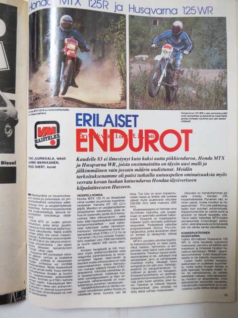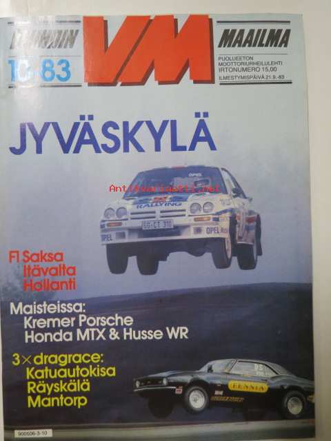 Vauhdin Maailma 1983 nr 10 -mm. Kremer katuPorsche r5, Formula 1 Itävalta ja Hockenheim, BMW beachbike, SM-piiki finali, Ahveniston syyskilpailut, Mantorp Drag Festival, Artukaisten ratakilpailu, Honda MTX ja Husee WR, Katuautokisa, Formula 1 maailma, Räyskälä Drag International, RR-finaalit ajettu.21 x 29 cm.