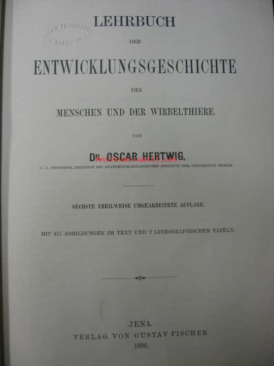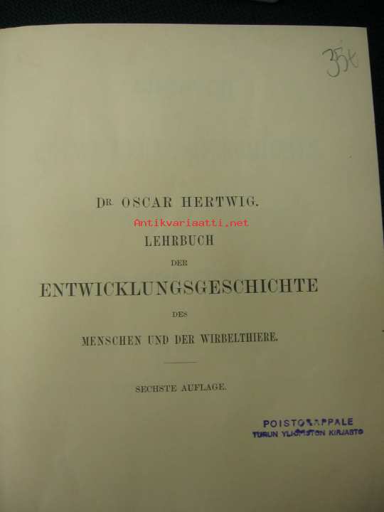 Hertwig Oscar, Jena. Verlag von G Fischer, 1898Turun Yliopiston kirjaston poistokappale. Mustavalkoisia piirroskuvia. Hieno nahkaselkämys.
