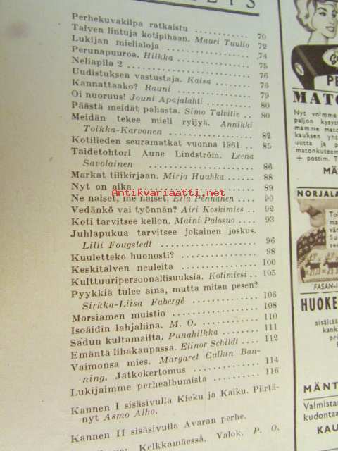 Kotiliesi 1961 nr 2, koti tarvitsee kellon, taidetohtori Aune Lindström, meidän tekee mieli ryijyä