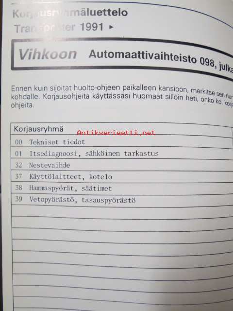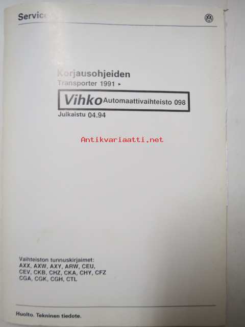 Korjausohjeiden Volkswagen Transporter 1991>, Automaattivaihteisto 098, vaihteiston tunnuskirjaimet AXX, AXW, AXY, ARW, CEU, CEV, CKB, CHZ, CKA, CHY, CFZ, CGA, CGK, CGH, CTL.