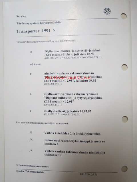 Korjausohjeiden Volkswagen Transporter 1991>, Digifant-suihkutus-ja sytytysjärjestelmä (2.0 l moott.), 01.96>, moottorin tunnus AAC.