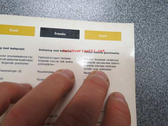 | Saatavilla | 1 kpl | | Sivuja | 2 | | Kunto | K3 | | Sidonta/painoasu | Pienpainate | | Kielet | Suomi, Ruotsi, Saksa, Hollanti, Tanska, Englanti |