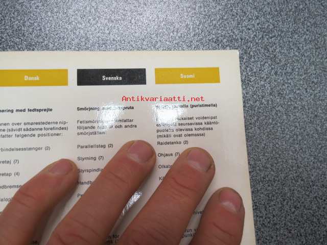 | Saatavilla | 1 kpl | | Sivuja | 2 | | Kunto | K3 | | Sidonta/painoasu | Pienpainate | | Kielet | Suomi, Ruotsi, Saksa, Hollanti, Tanska, Englanti |
