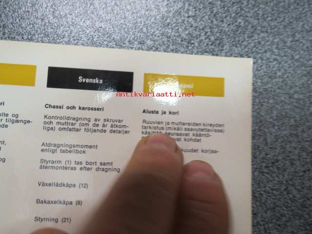 | Saatavilla | 1 kpl | | Sivuja | 2 | | Kunto | K3 | | Sidonta/painoasu | Pienpainate | | Kielet | Suomi, Ruotsi, Saksa, Hollanti, Tanska, Englanti |