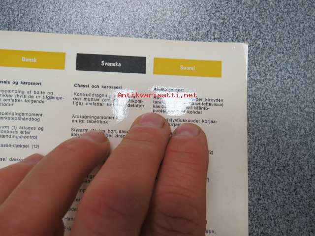 | Saatavilla | 1 kpl | | Sivuja | 2 | | Kunto | K3 | | Sidonta/painoasu | Pienpainate | | Kielet | Suomi, Ruotsi, Saksa, Hollanti, Tanska, Englanti |