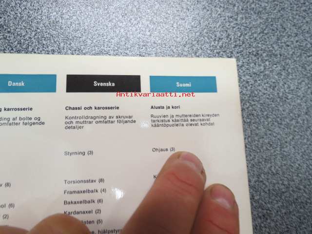 | Saatavilla | 1 kpl | | Sivuja | 2 | | Kunto | K3 | | Sidonta/painoasu | Pienpainate | | Kielet | Suomi, Ruotsi, Saksa, Hollanti, Tanska, Englanti |