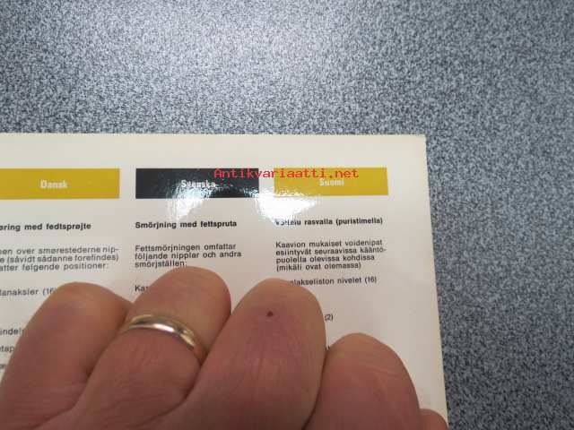 | Saatavilla | 1 kpl | | Sivuja | 2 | | Kunto | K3 | | Sidonta/painoasu | Pienpainate | | Kielet | Suomi, Ruotsi, Saksa, Hollanti, Tanska, Englanti |