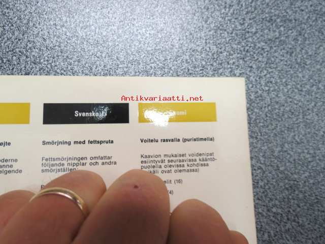 | Saatavilla | 1 kpl | | Sivuja | 2 | | Kunto | K3 | | Sidonta/painoasu | Pienpainate | | Kielet | Suomi, Ruotsi, Saksa, Hollanti, Tanska, Englanti |